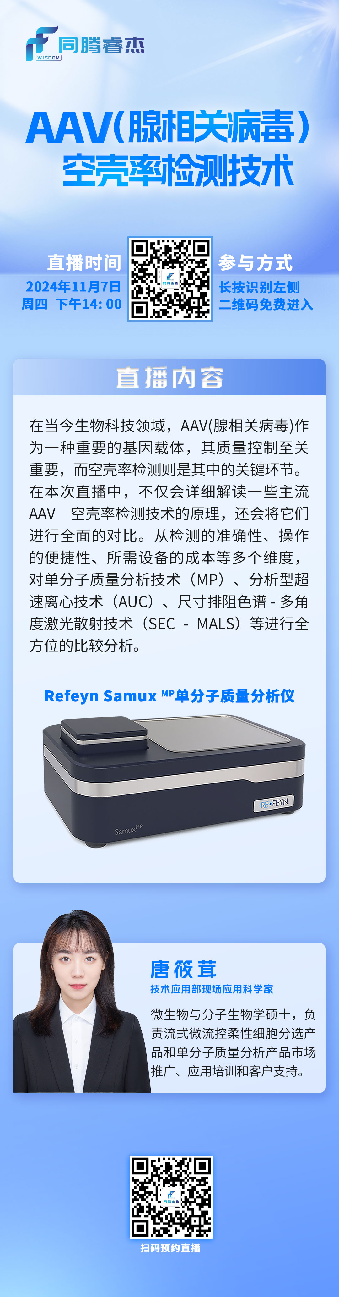 同騰睿杰(上海)生物科技有限公司,將于11月7日(星期四)下午14:00,舉辦一場線上直播分享會。本次直播的特邀主講嘉賓是同騰睿杰現場應用科學家——唐筱茸,她將以“AAV(腺相關病毒)空殼率檢測技術”為主題,帶領大家,揭開AAV空殼率檢測技術的神秘面紗。