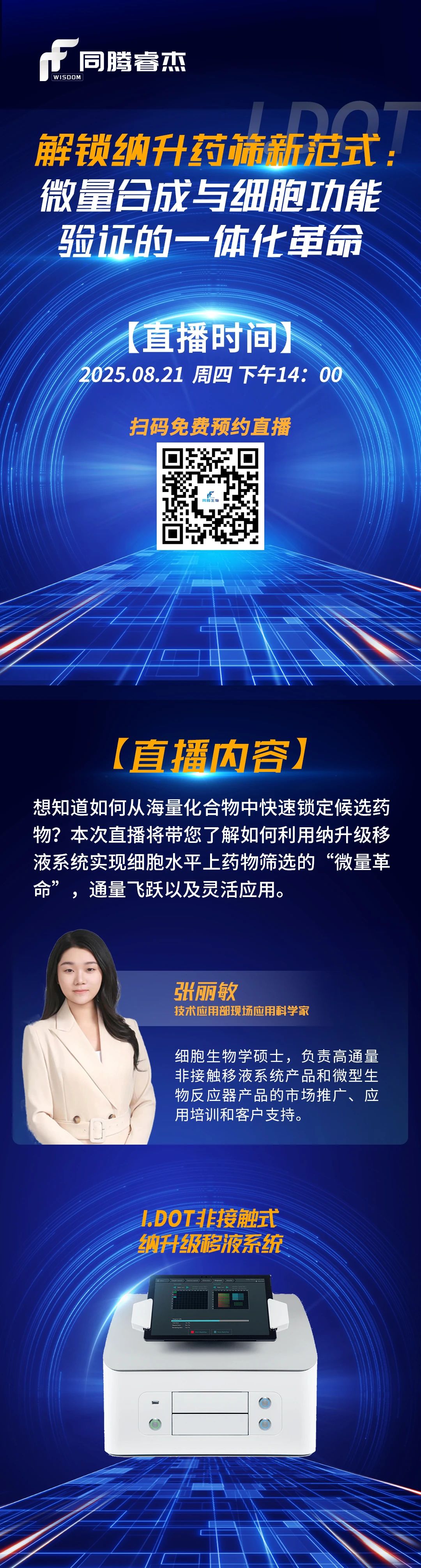 同騰睿杰(上海)生物科技有限公司誠摯邀請您參與這場干貨滿滿的線上分享盛會。本次分享會定于8月21日(星期四)下午14:00準時開播,屆時公司現場應用科學家張麗敏將作為主講嘉賓,帶來題為《解鎖納升藥篩新范式:微量合成與細胞功能驗證的一體化革命》的深度分享。 期待與您在云端相聚,共赴這場知識與創新的碰撞之旅!