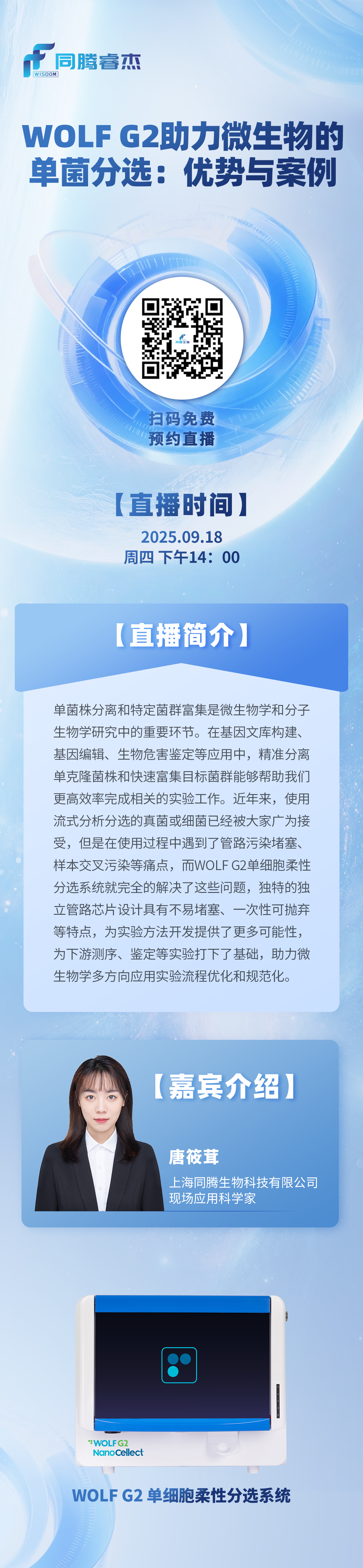 為深入分享這一技術的實踐價值,同騰睿杰(上海)生物科技有限公司誠摯邀請您參與本次干貨十足的線上分享會。分享會將于 9月18日(星期四)14:00準時開播,屆時,公司現(xiàn)場應用科學家唐筱茸將作為主講嘉賓,帶來題為《WOLF G2 助力微生物單菌分選:優(yōu)勢與案例》的深度解析。