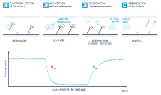 以無與倫比的細節解析分子間相互作用。在分析物分子的存在時,染料的熒光被淬滅。熒光的變化直接反映分子的結合和解離。