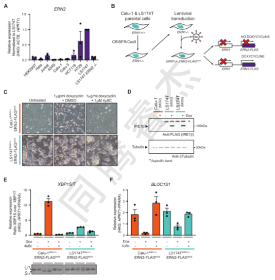 圖1. IRE1β活性在杯狀細(xì)胞中過表達(dá)時減弱。A圖,RT-qPCR分析ERN2IRE1β在人細(xì)胞系中的轉(zhuǎn)錄表達(dá)。對培養(yǎng)物進(jìn)行三次取樣,發(fā)現(xiàn)ERN2的表達(dá)與LS174T親本細(xì)胞中的表達(dá)有關(guān)。用于進(jìn)一步研究的細(xì)胞系示意圖。首先,利用CRISPR/Cas9建立了LS174T和CALU-1親本的ERN1-/-克隆。然后,用Teton模塊轉(zhuǎn)導(dǎo)ERN1-/-細(xì)胞表達(dá)多西環(huán)素調(diào)控的β-FLAG。C圖顯示了過度表達(dá)IRE1β-FLAG的培養(yǎng)物的表型。左圖顯示未經(jīng)處理的培養(yǎng)物,中圖顯示接受1μg/ml多西環(huán)素作用72小時的培養(yǎng)物(從而表達(dá)IRE1β-FLAG),右圖顯示接受1μg/ml多西環(huán)素和1μM IRE1核酸內(nèi)切酶抑制劑4μ8C的培養(yǎng)物。代表了三個獨(dú)立的實(shí)驗(yàn)。D Western印跡驗(yàn)證(C)中使用的細(xì)胞系中的轉(zhuǎn)基因表達(dá)。收集轉(zhuǎn)基因誘導(dǎo)24小時后剩余的貼壁細(xì)胞,用免疫印跡法檢測FLAG-IRE1β的表達(dá)。以微管蛋白作為載藥對照。感染的多重性(MOI)表示添加的病毒顆粒的理論數(shù)量。E,F(xiàn) RT-qPCR分析轉(zhuǎn)基因誘導(dǎo)后24小時XBP1s/T(E)和BLOC1S1轉(zhuǎn)錄水平(F)。代表三個獨(dú)立的實(shí)驗(yàn),每個條件有三個重復(fù)。(E)下圖顯示XBP1在常規(guī)PCR檢測的同一樣本中的剪接。快速遷移帶為剪接XBP1轉(zhuǎn)錄本,慢遷移帶為XBP1非剪接轉(zhuǎn)錄本。
