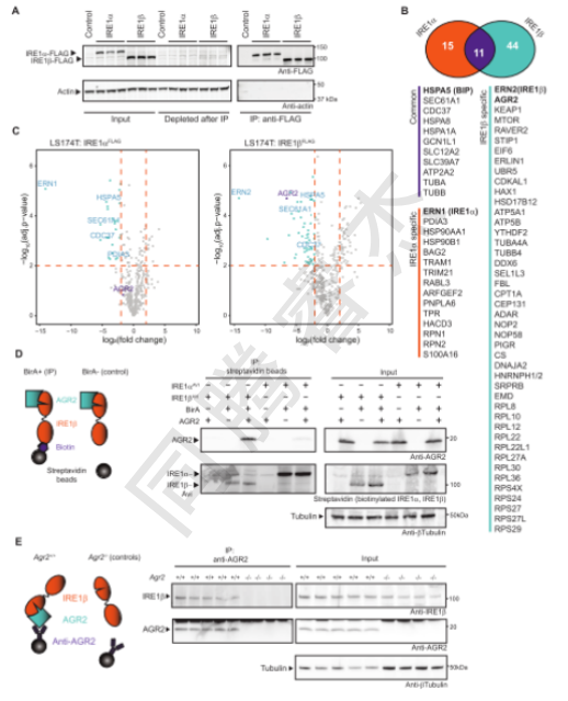 非杯狀細(xì)胞(Calu-1)中過表達(dá)IRE1β會引發(fā)劇烈細(xì)胞死亡與XBP1剪接(Figure 1C-E),而杯狀細(xì)胞樣LS174T中IRE1β活性顯著降低(Figure 1C、1E)。AP-MS與Co-IP驗(yàn)證顯示,AGR2與IRE1β特異性結(jié)合,不與IRE1α互作,且體內(nèi)小鼠結(jié)腸組織中也存在該相互作用(Figure 2B-E),提示AGR2是IRE1β的杯狀細(xì)胞特異性調(diào)控因子。