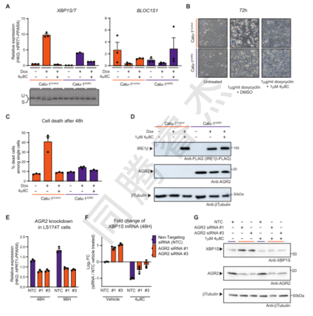 圖3. 共表達(dá)可抑制IRE1β的核酸內(nèi)切酶活性。A圖用1μg/ml多西環(huán)素誘導(dǎo)轉(zhuǎn)基因24小時后,進(jìn)行XBP1S/T和BLOC1S1轉(zhuǎn)錄水平的RT-qPCR分析。下圖顯示了XBP1在相同樣本中的剪接情況,這些樣本通過常規(guī)的聚合酶鏈?zhǔn)椒磻?yīng)檢測。代表三個獨(dú)立的實(shí)驗(yàn),每個條件有三個重復(fù)。B圖片顯示了過度表達(dá)IRE1agr2-FLAG和不表達(dá)β的培養(yǎng)物的表型。左側(cè)面板顯示未經(jīng)處理的培養(yǎng)物,中間面板顯示接受1μg/ml多西環(huán)素72小時的培養(yǎng)物,右側(cè)面板中的培養(yǎng)物接受1μg/ml多西環(huán)素和1μM 4μ8C。代表了三個獨(dú)立的實(shí)驗(yàn)。48小時后,在加入和不加入外源β的情況下,對高表達(dá)IRE1AGR2-FLAG的細(xì)胞死亡進(jìn)行定量。培養(yǎng)皿中所有細(xì)胞經(jīng)AnnexinV和Live/Dead染色后進(jìn)行流式細(xì)胞儀分析。所有單陽性和雙陽性細(xì)胞均為死亡細(xì)胞。代表2個獨(dú)立實(shí)驗(yàn),每個條件有三個重復(fù)。D分析IRE1、β-FLAG和AGR2在用于C的細(xì)胞系中的表達(dá)。僅收集仍附著在培養(yǎng)皿中的細(xì)胞,并用抗FLAG和抗AGR2來檢測IRE1β和AGR2的表達(dá)。以微管蛋白作為載藥對照。在LS174TERN1-/-IRE1FLAG-DOX細(xì)胞中驗(yàn)證agr2基因敲除效率。NTC是siRNA的非靶向控制池,# 1和 # 3是siRNA的靶向AGR2。4μ8C或DMSO(載體)部分擊倒和/或處理后XBP1剪接的變化。剪接顯示為NTC/Vehicle處理的細(xì)胞的log2倍變化。E和F代表三個獨(dú)立的實(shí)驗(yàn),每個條件有三個重復(fù)。G蛋白印跡確證(E)和(F)。72小時后提取蛋白質(zhì),檢測XBP1s、AGR2和微管蛋白的表達(dá)。