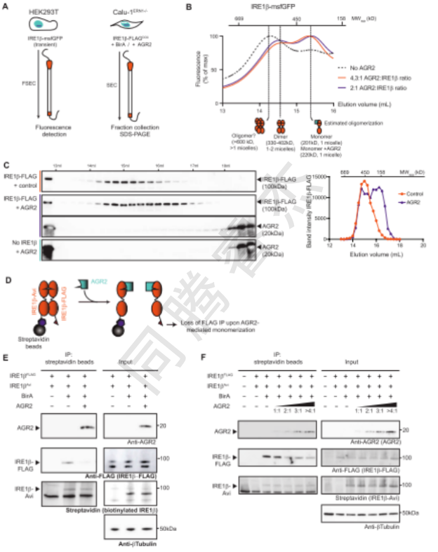 圖4. Agr2通過破壞ire1β二聚體來阻斷β的活性。A圖為B和C的凝膠過濾實(shí)驗(yàn)的示意圖概述B在HEK293T裂解物的洗脫過程中測量到的msfGFP熒光,該裂解物在沒有agr2(黑點(diǎn)跡線)或存在agr2(橙色和紫色痕跡表示不同比例的轉(zhuǎn)基因agr2:ire1ββ)的情況下高表達(dá)ir1 DNA。最高標(biāo)度代表大致的洗脫圖譜和蛋白質(zhì)標(biāo)準(zhǔn)的預(yù)期分子量。底圖顯示了基于蛋白質(zhì)標(biāo)準(zhǔn)和先前獲得的洗脫圖譜(灰色)的預(yù)期齊聚狀態(tài)。實(shí)驗(yàn)進(jìn)行了一次。在沒有或存在額外β表達(dá)的情況下,從CALU-1ERN1-/IRE1AGR1FLAG-DOX細(xì)胞的蛋白裂解物凝膠過濾后收集的組分中c IRE1AGR2-FLAG的表達(dá)。折線圖顯示了凝膠中的帶強(qiáng)度的量化。代表了兩個獨(dú)立的實(shí)驗(yàn)。E和F中競爭IP實(shí)驗(yàn)的D示意圖。IRE1β用等摩爾量的Avittag或FLAG標(biāo)記表示。在被Bira生物素化后,如果已經(jīng)形成二聚體,則在鏈霉親和素IP之后將同時檢測到avi標(biāo)簽和FLAG標(biāo)簽。如果添加另一種蛋白質(zhì)(例如AGR2)會阻止這一過程,預(yù)計會失去信號。E競爭IP顯示AGR2共表達(dá)時二聚體形成丟失。標(biāo)本用抗AGR2、抗FLAG和鏈霉親和素免疫印跡。在輸入樣品中使用微管蛋白作為加載對照。代表了兩個獨(dú)立的實(shí)驗(yàn)。F競爭IP表明,隨著AGR2共表達(dá)的增加,二聚體的形成隨濃度的增加而喪失。標(biāo)本用抗AGR2、抗FLAG和鏈霉親和素免疫印跡。在輸入樣品中使用微管蛋白作為加載對照。代表了兩個獨(dú)立的實(shí)驗(yàn)。